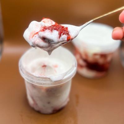 Um convite à doçura italiana. Base aveludada de baunilha e o toque rústico e envolvente da geleia de morango assada mesclada.