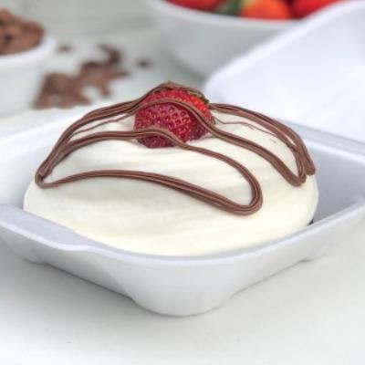 Bolo de chocolate molhadinho, morangos dentro do bolo, mousse de Ninho finalizado com morango e Nutella