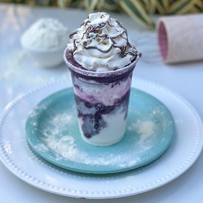 Camadas de mousse de Ninho que parece um sorvetiiiinho cremoso, camada de açaí, finalizada com chantininho e Nutella.