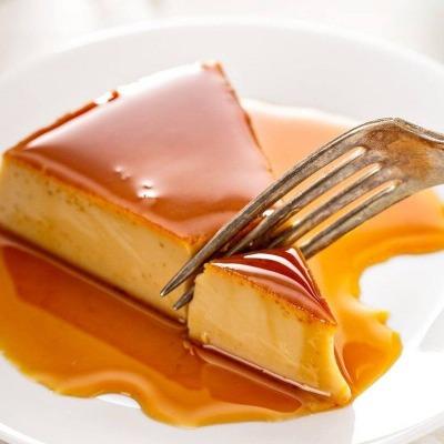 Fatia de pudim de leite, cremosa, lisinha que derrete na boca, calda de caramelo perfeito.