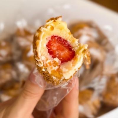 Um morango envolvido no brigadeiro de Ninho cremoso e massa folhada crocante.