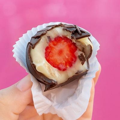 Um morango envolvido no brigadeiro de Ninho e banhado no chocolate ao leite.